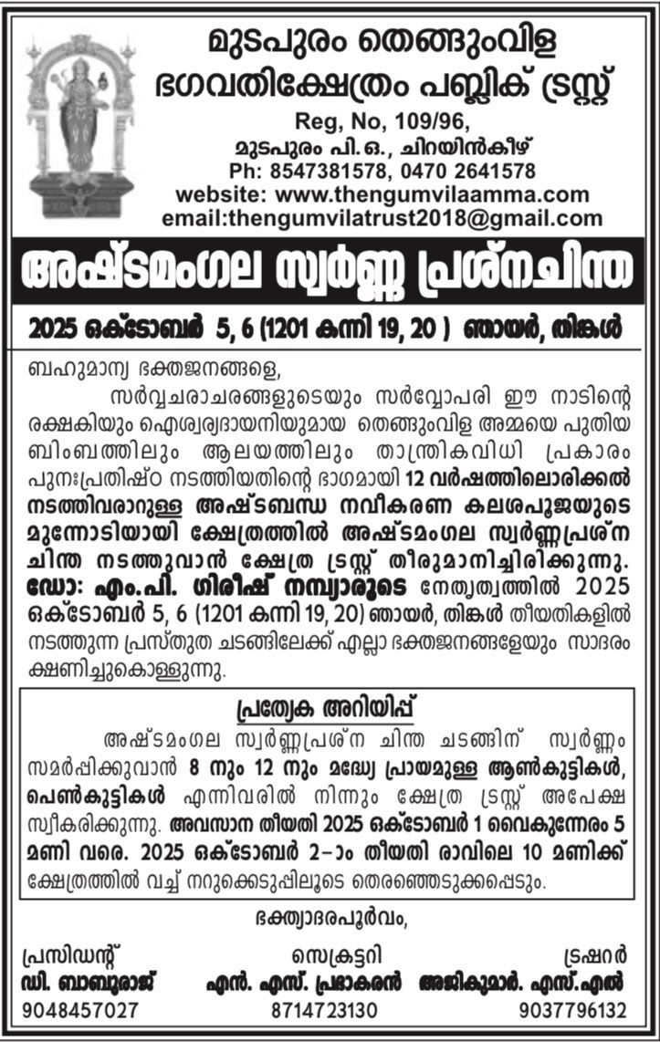 രാമായണ മാസാചരണം - പ്രത്യേകം സജ്ജീകരിച്ച മണ്ഡപത്തില്‍ എല്ലാ ദിവസവും രാമായണപൂജ, രാമായണ പാരായണം, ഔഷധകഞ്ഞി വിതരണം, ശ്രീരാമപട്ടാഭിഷേകം, രാമായണത്തെ അധികരിച്ചുകൊണ്ടുള്ള പ്രശ്നത്തോരി. വൈകുന്നേരം 6.00 മണി മുതല്‍ ആദ്ധ്യാത്മിക പ്രഭാഷണം.